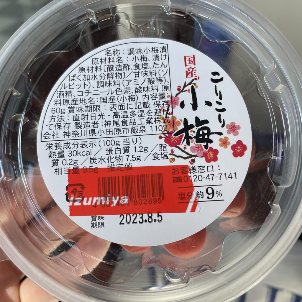 Look for small packages or jars labeled “梅干し” (umeboshi) in the kanji script.